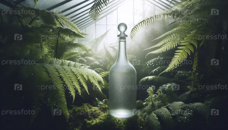 Прозрачный макет стеклянной бутылки с нежной пробкой, стоящей посреди пышного, Ai generated image