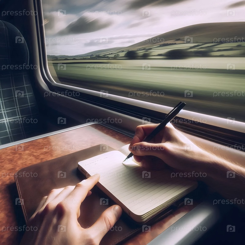 Одинокий писатель находит вдохновение во время поездки на поезде, записывая свои мысли в блокноте против размытого пейзажа, Ai generated image