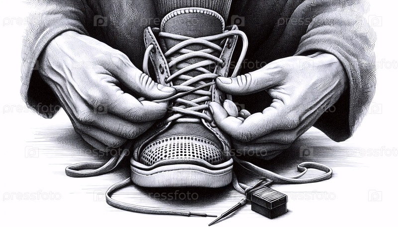 Руки, связывающие обувь Шнурки чернила рисование художественная печать, Ai generated image