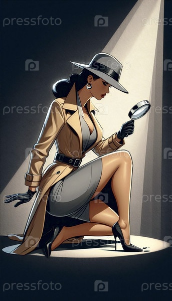Девушка-принтер в роли детектива с увеличительным стеклом, расследующей подсказки, Ai generated image