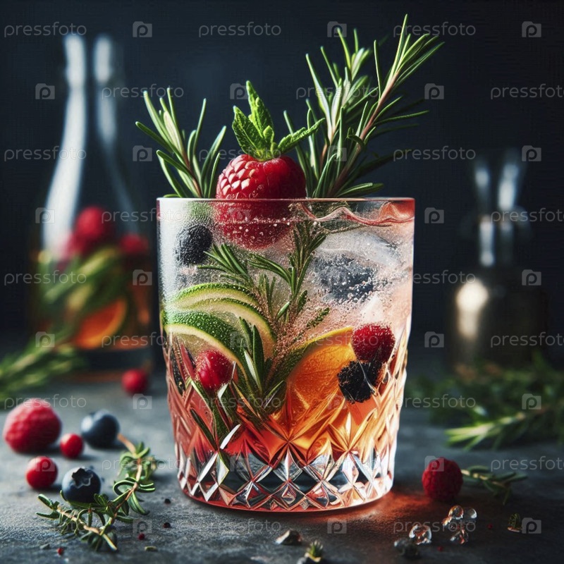 Сложный безалкогольный коктейль в кристаллическом стакане, Ai generated image