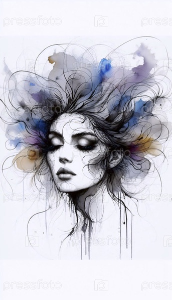 Портрет в очертаниях чернила и волосы акварель, Ai generated image