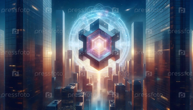 Неоновый знак ангела, плавающий над небоскребами в центре города, Ai generated image