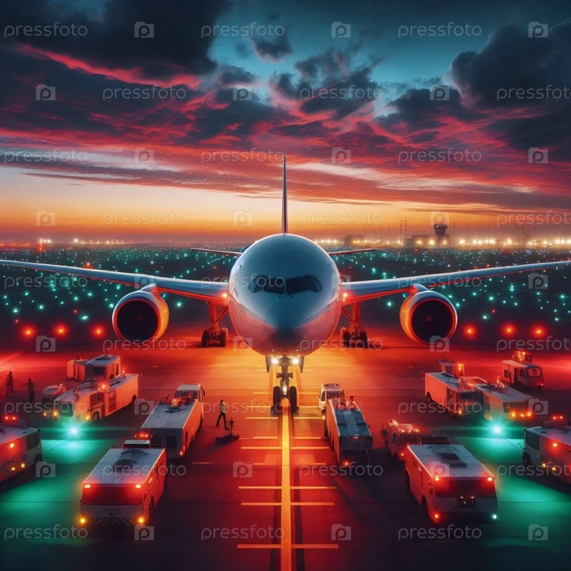 Самолет с включенными навигационными огнями в сумерках, Ai generated image