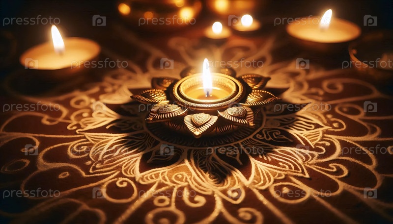 Лампа diya с рисунками ранголи вокруг нее, Ai generated image