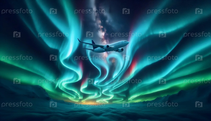 Самолет пролетает через северные лучи, Ai generated image