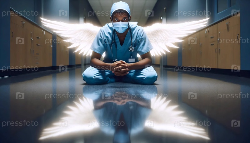 Усталая медсестра с полупрозрачными ангелскими крыльями в коридоре больницы, Ai generated image