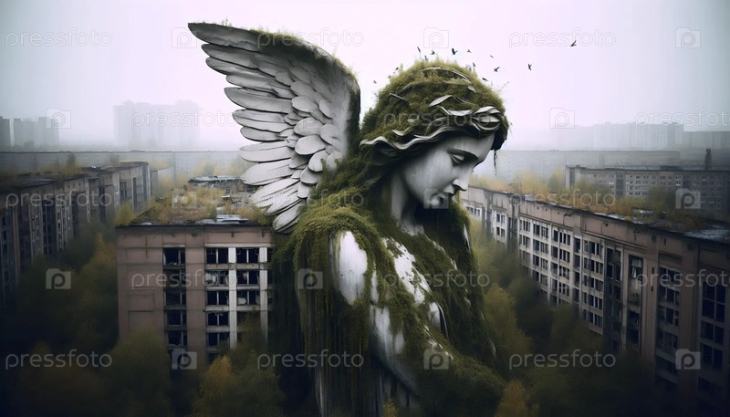 Каменная статуя ангела, покрытая плющом на забытой крыше, Ai generated image