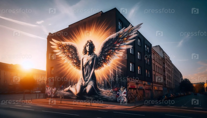 Гигантская фреска с ангелом на кирпичной аллее в золотой век, Ai generated image