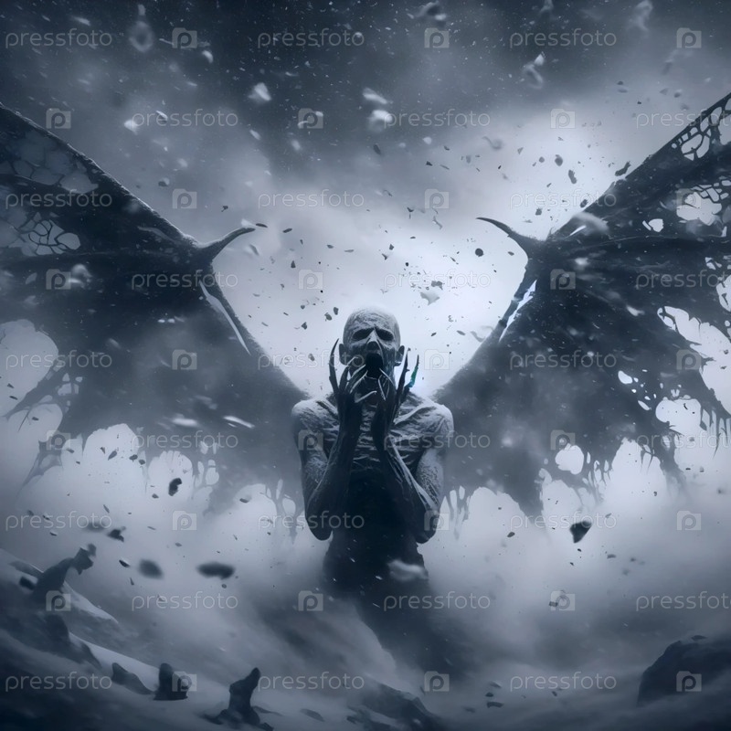 Скелетный ангел с крыльями, съеденными молью в заброшенной церкви, Ai generated image