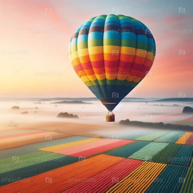 Балон с горячим воздухом, дрейфующий вблизи облаков на рассвете, Ai generated image