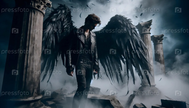 Темный готический ангел с разорванными крыльями в пост-апокалиптических руинах, Ai generated image