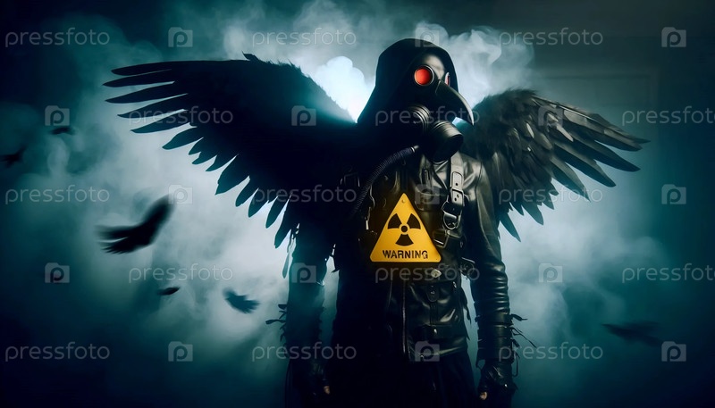 Постапокалиптический ангел с газовой маской и ореолом из колючей проволоки, Ai generated image