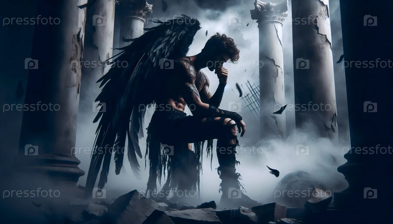 Темный готический ангел с разорванными крыльями в пост-апокалиптических руинах, Ai generated image