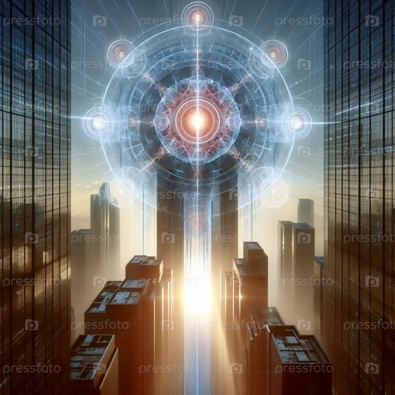 Неоновый знак ангела, плавающий над небоскребами в центре города, Ai generated image
