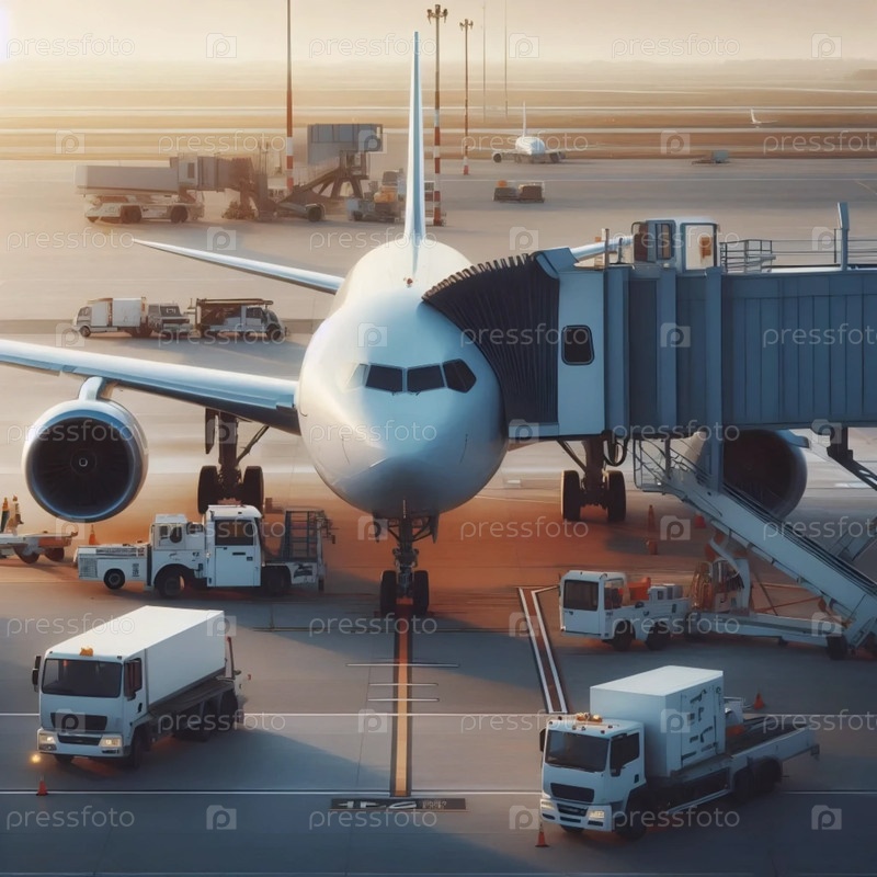 Самолет у ворот с реактивным мостом и транспортными средствами наземного обслуживания, Ай создал изображение