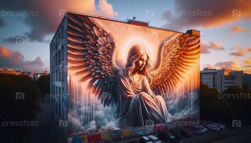 Гигантская фреска с ангелом на кирпичной аллее в золотой век, Ai generated image