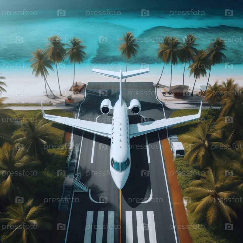 Вид с дронов частного самолета на тропической взлетно-посадочной полосе, Ai generated image