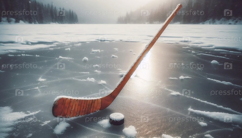 Винтажная хоккейная клюшка на замерзшем озере, Ai generated image