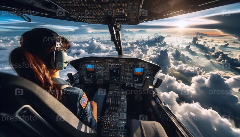 Вид кабины пилотажа во время полета над облаками, Ai создал изображение