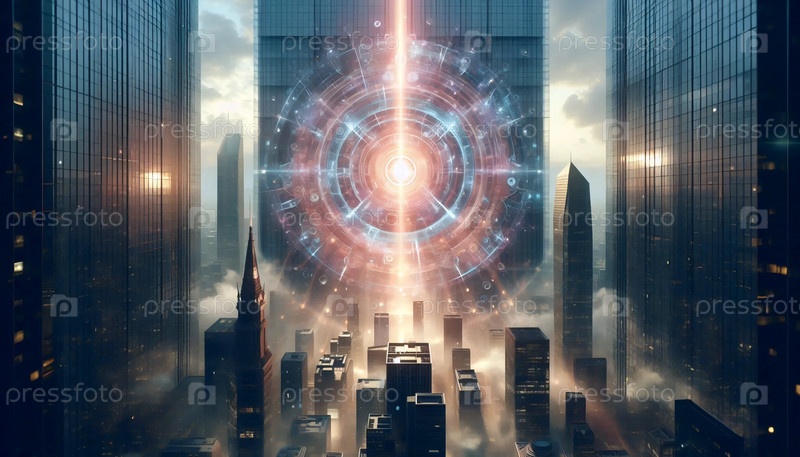 Неоновый знак ангела, плавающий над небоскребами в центре города, Ai generated image
