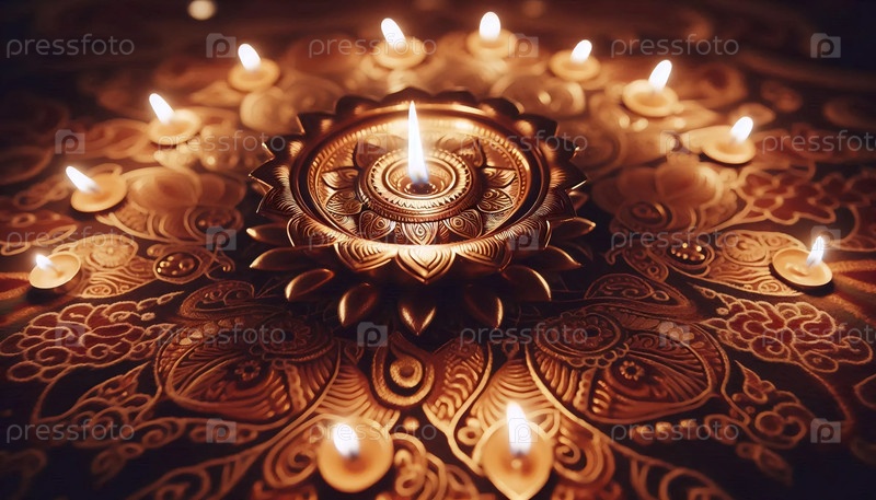 Лампа diya с рисунками ранголи вокруг нее, Ai generated image