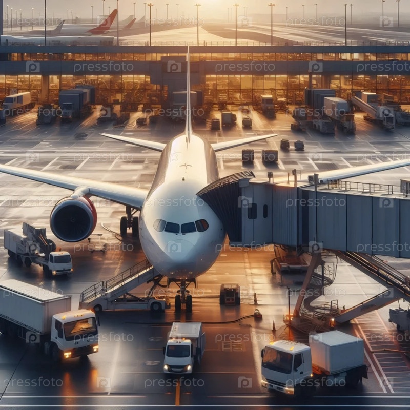 Самолет у ворот с реактивным мостом и транспортными средствами наземного обслуживания, Ай создал изображение
