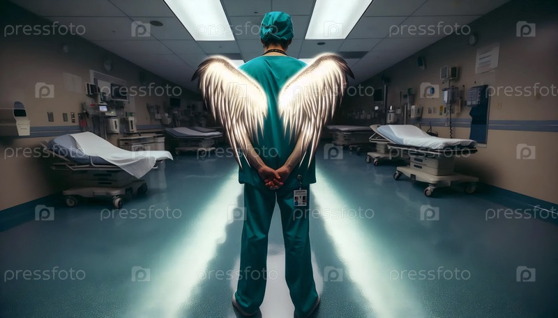 Усталая медсестра с полупрозрачными ангелскими крыльями в коридоре больницы, Ai generated image