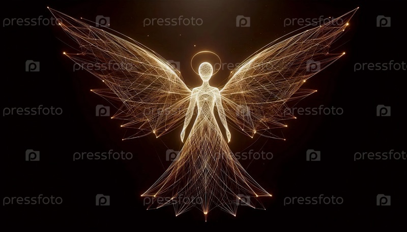 Золотой контур ангела с проволокой, плавающего в темном пространстве, Ai generated image