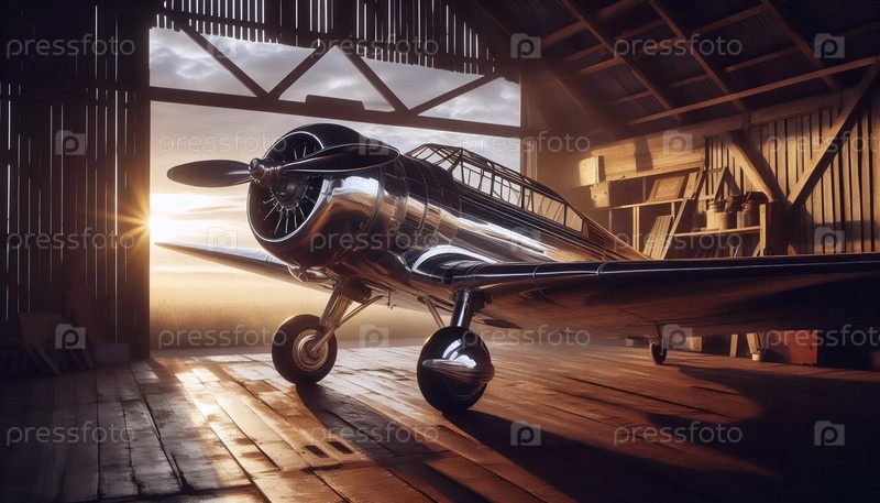 Старый пропеллерный самолет в ангаре на рассвете, Ai generated image