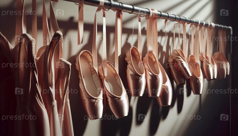 Шелковые балетные тапочки висят на стойке для костюмов, Ai generated image