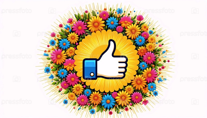 Кнопка "Лайк" в центре пышной венки смешанных цветов, Ай создал изображение