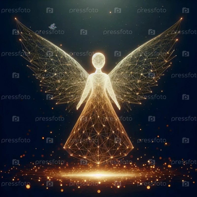 Золотой контур ангела с проволокой, плавающего в темном пространстве, Ai generated image