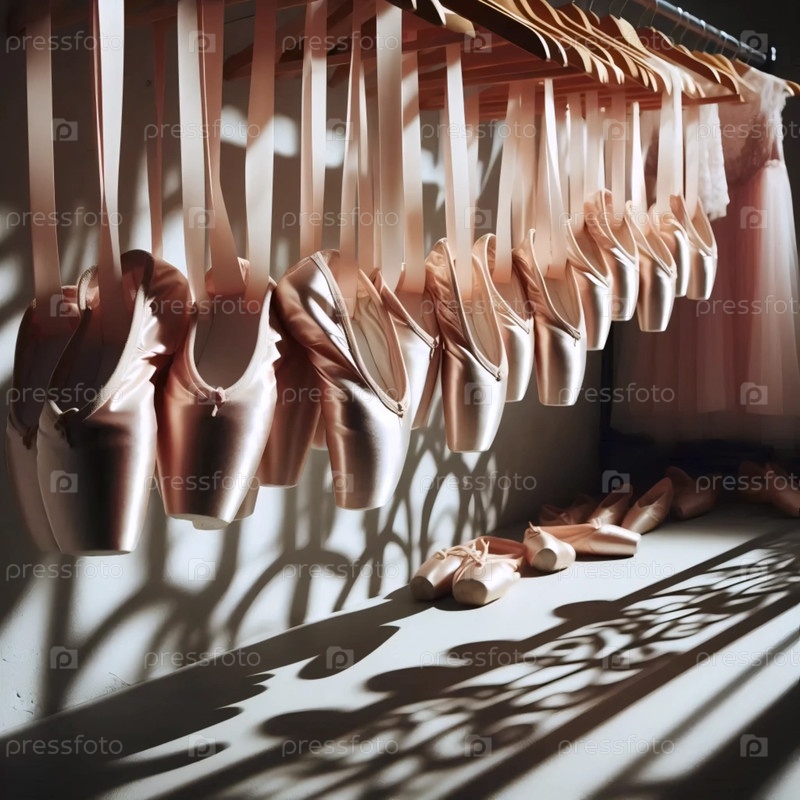 Шелковые балетные тапочки висят на стойке для костюмов, Ai generated image