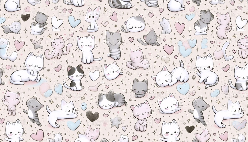 Повторяющийся рисованный вручную причудливый шаблон котят, Ai generated image