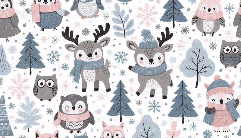 Милые скандинавские зимние животные Бесшовный рисунок, Ai generated image