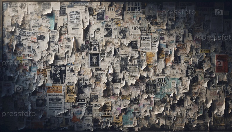 Простая натюрмортная картина очищающейся стены, где старые плакаты создают слойный гобелен из текстуры и фрагментированного текста, Ai генерирует изображение