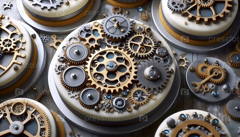 Дисертационное искусство, вдохновленное стемпанком с использованием печенья в форме коробки передач и тортов с металлической пылью, Ai created image