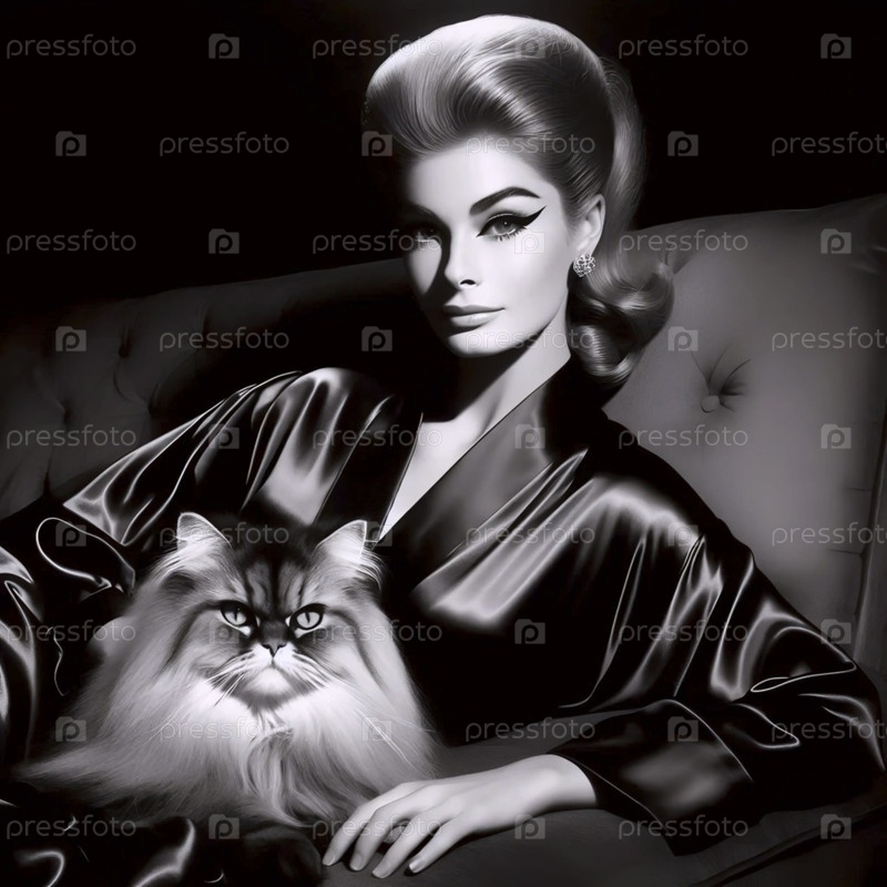 Гламурный портрет женщины со своей кошкой, Ai generated image