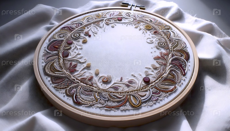 Детальный макет кольца для вышивки, показывающий пустую область ткани, плотно растянутую, окруженную сложной бусинной вышивкой, Ai generated image
