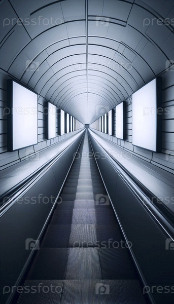 Вертикальный последовательный макет панели проходит рядом с пустым движущимся эскалатором на современной станции метро, Ai generated image