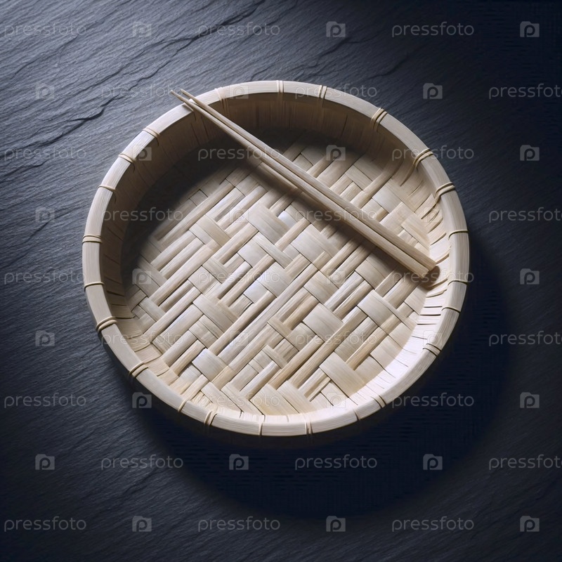 Круглый, пустой макет бамбуковой суши-платки со подставкой на палочках, на темной поверхности сланца, Ai generated image