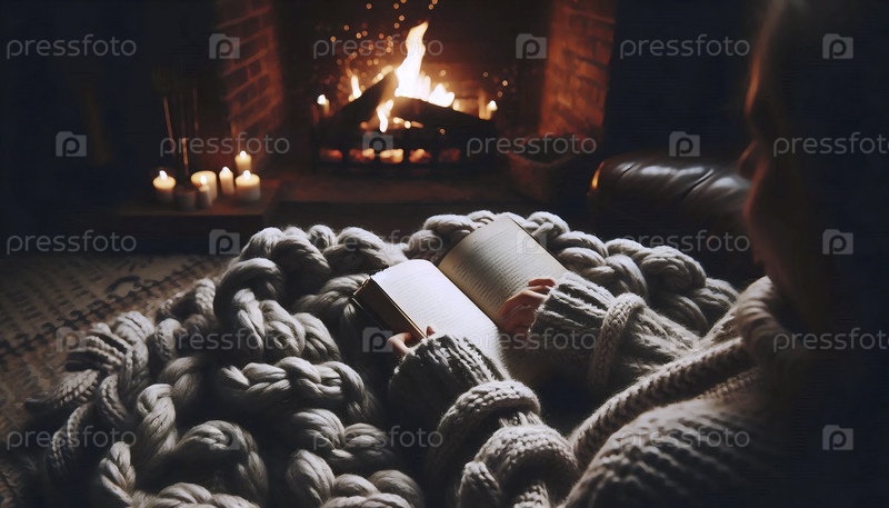 Момент цифровой детоксикации и простой радости, чтение физической книги у трескающегося камина, Ai generated image