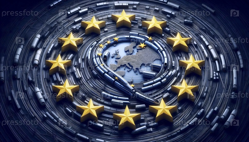 Флаг Европейского союза сделан из взаимосвязанных железнодорожных сетей, Ai generated image