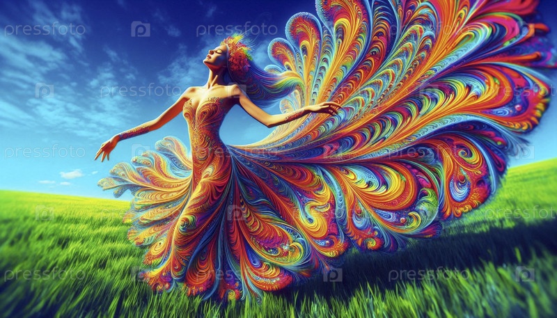 Яркая реклама для новой синтетической ткани, показывающая женщину в красочном платье из пейзли, радостно вращающуюся на поле маргариток, Ai generated image