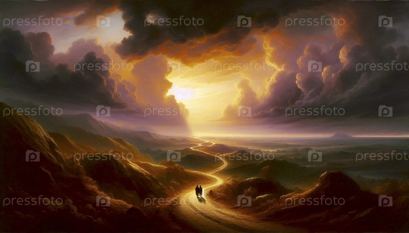 Дорога в Эммаус на закате, романтическая живопись, Ai generated image