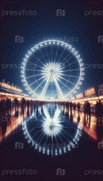 Живая вечерняя сцена на краевой ярмарке, с огнями обозрительного колеса, отражающимися в луже, Ai создала изображение
