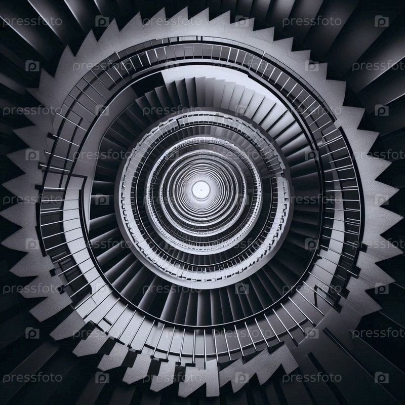 Симметричный снимок спиральной лестницы, рассматриваемой непосредственно ниже и образующей идеальный геометрический вихрь, Ai generated image
