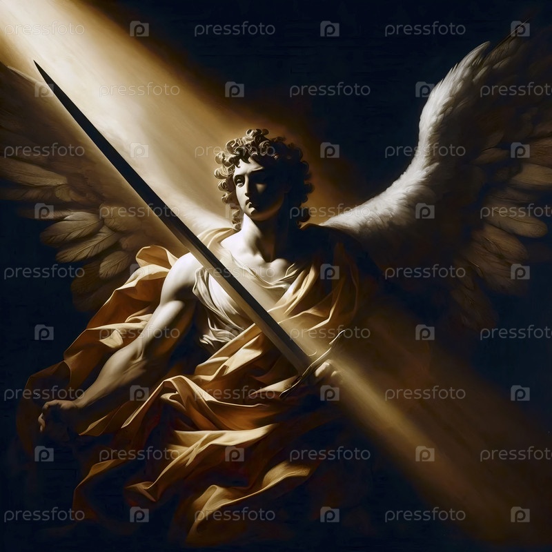Ангел как небесный воин, Караваджо chiaroscuro, Ai generated image