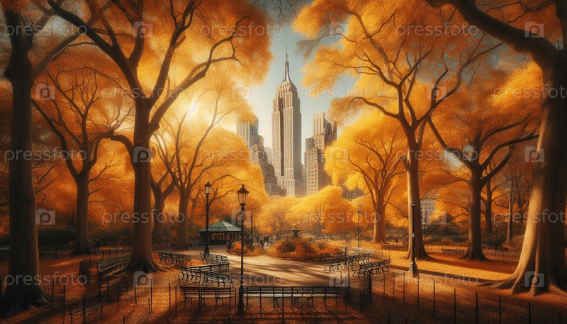Осень в Центральном парке с Эмпайр Стейт Билдинг, Ai generated image